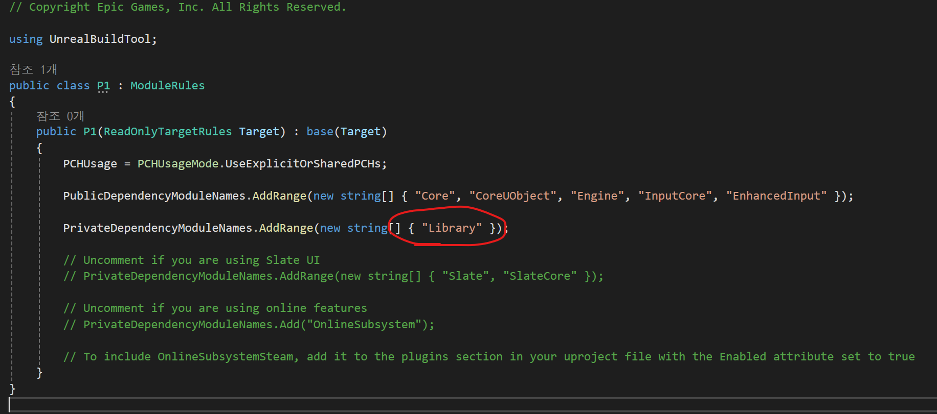 public Library(ReadOnlyTargetRules Target) : base(Target) // ReadOnlyTargetRules 타입의 Target을 받아 부모 클래스에 전달