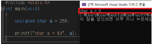 그렇기 때문에 1Byte 양수만 취급하는 자료형인 unsigned char의 표현 범위를 넘어 섰기 때문에 값은